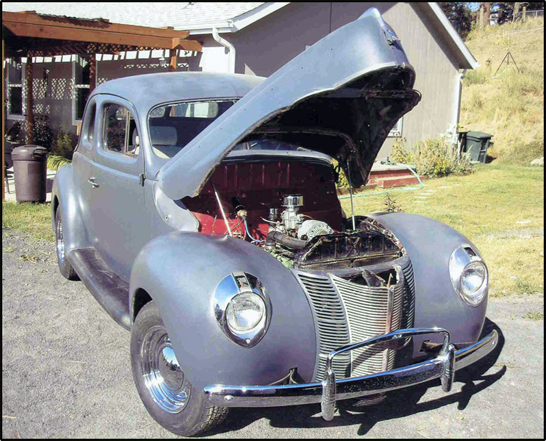 The engine is a 302 Cobra clone, B&M C-4 transmission, Curry Ford 9 inch rear, '69 Firebird gas tank, '48 Chevy tail lights, Vette disc brakes and a '49 Willys I-beam front axle. The rig weighs 3,200 lbs., 10" slicks on 8" rims. About 80% of the work was mine, the rest was “pro”.