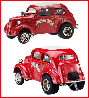 Besides the venerable Willys cars, the Ford of England Anglia was the car of choice for many drag teams during the gasser wars era. Small, light and readily available. Shoehorn in a big motor, jack 'em up, and stuff a straight axle and big tires underneath, and hang on! Relive the gasser era with this 1/24th scale replica of the Shores & Hess "Skipper's Critter" Anglia. This all metal model is exclusively authorized by Skip Hess who hand-signs and numbers a certificate of authenticity that accompanies each model. Details include a correct interior, correct wheels and body markings, chrome blower scoop, and wheelie bar. A parachute and white top insert add to the realism of this gasser. This legend of the drag strip will be limited to 2500 pcs. worldwide. |