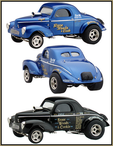 "Stone, Woods & Cook 1941 Willys A/Gas Supercharged". Fred Stone, Tim Woods, and Doug Cook, who would have known what indelible mark these three men would leave in drag racing history. It is undeniable that the SW&C Willys has become the car that says more about going fast with doors and fenders than probably any other race car of the gasser wars era. The team assembled and raced their first car in 1961. It was a metallic blue car and was wrecked very early on. The useable parts were transferred to another body which was a light blue car. After another accident the car was painted black for the 1965 season and which was almost unstoppable in this color. Finally the car was repainted metallic blue and remains this color today. Now available in 1/24th scale, these all metal hand built models are built in the USA by Motor City! Exclusively authorized by SW&C and limited to 2500 models, each model comes with a certificate of authenticity signed by Mike Cook, Doug Cook's son. The models are nearly 6-1/2" long and weigh nearly 1-1/4 lbs. The deep metallic blue paint job is flawless and highlighted by chrome body trim, door handles, grille, deck lid fasteners, hood latches, and more. With a chrome straight axle, chrome fender exit headers and polished wheels, the miniature is stunning. The black version features similar chrome trim but has different gold lettering correct for that version of the racer. Own this pair of models and be the envy of your fellow bench racers!